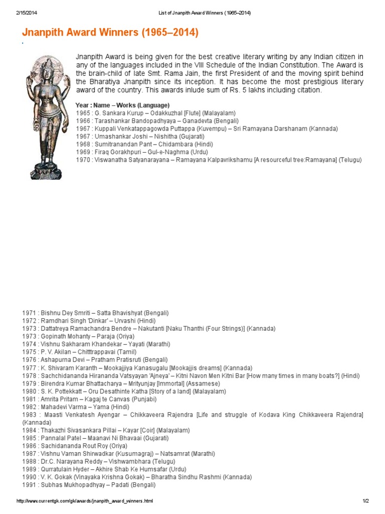 List Of Bharatiya Gyanpith Awards Jnanpith Award Winners Indian Literature Languages Of India - Gyanpeeth award winners of bengali, malayalam, kannada, gujarati languages are listed below.